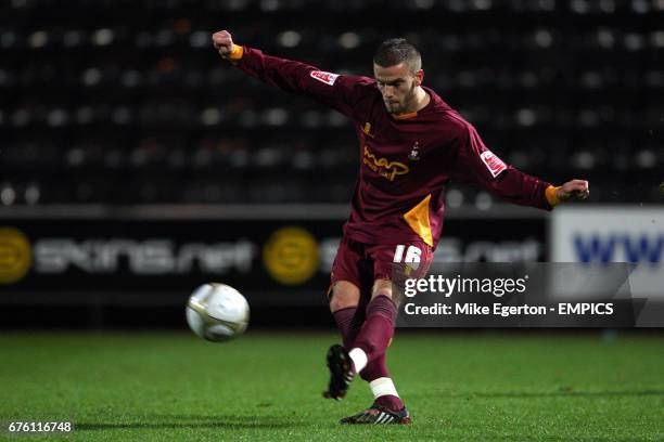 Jon taking a shot at goal for Bradford City against Nyotts County