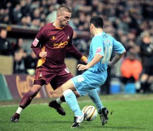 Jonathan opted to sign for Stuart McCall at Bradford City and made his proffessinal debut in the League Cup 1st round against Nottingham Forest at The City Ground. Having made an impressive debut, it ended on a sour note in the 89th minute when he recieved a red card for a lunge at Forest forward Nathan Tyson. Having served a 3 match ban he made his Football League debut in an away game against Shrewsbury Town at the New Meadow on the 5th September 2009. He made his full home debut at Valley Parade on Sept 26th against Chesterfield.. Jonathan made 27 appearances for Bradford City in that season before Stuart McCall left the club to be replaced by Peter Taylor. Jonathan didn't figure in Taylors plans and was released at the end of the season.