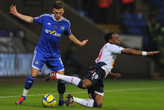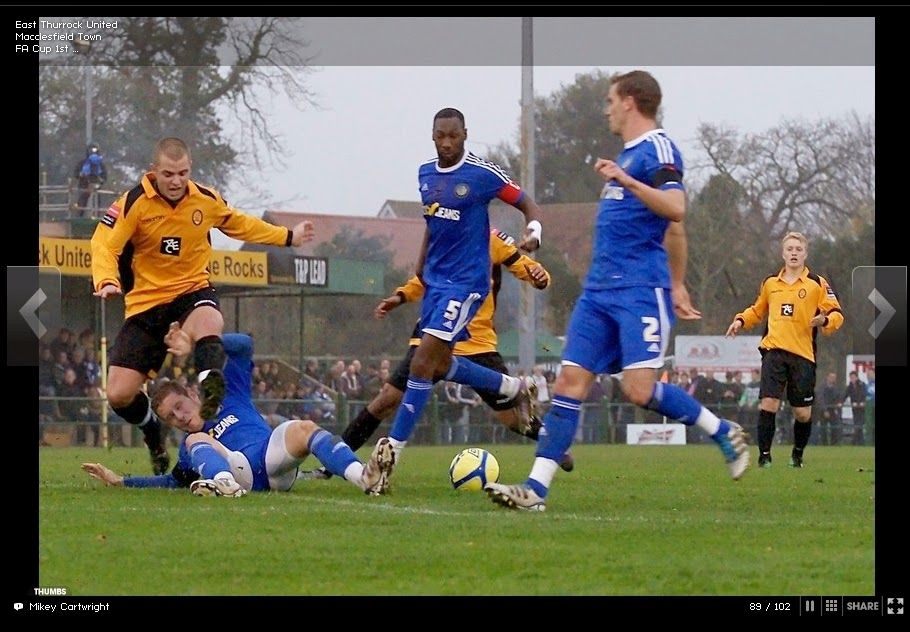 Jonathan slides in against East Thurrock United in the FA Cup for Macclesfield Town.